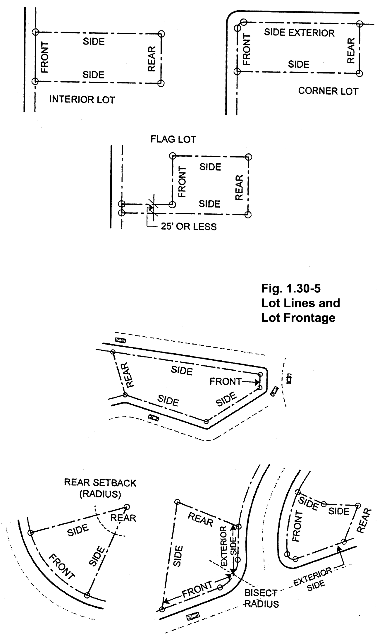 Lot, interior: A lot with street frontage and whose side lot lines are the side lot lines of adjacent lots that front on the same street. [See Fig. 1.30-5]