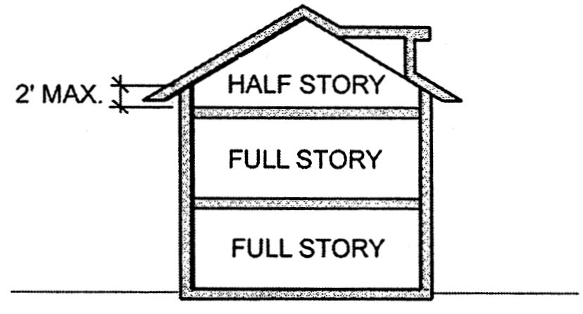 Story, half: A portion of a building within a hip, gable or similar sloping roof containing space that meets the dimensional criteria for habitable space (70 square feet or larger with a minimum seven feet clearance in each of three dimensions), but is limited such that the wall plates on at least two opposite exterior (vertical) walls, which constitute at least 50 percent of the perimeter wall area at that floor level, are not more than two feet above rough floor level.