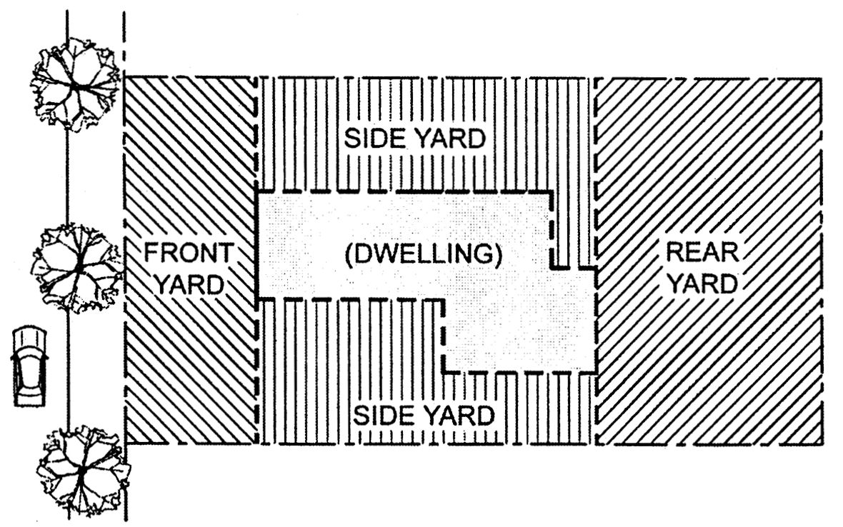 The side yard lies between the side lot line and the side wall(s) of the dwelling and extends from the front yard to the rear yard.