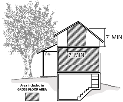 Floor area, gross: The sum of the gross horizontal areas of the several floors of a building, as measured from the rough exterior faces of the exterior walls, or (if applicable) from the centerline of a common wall between two attached buildings. "Floor area, gross" also includes the total area of any attached garage, and includes any carport, porch or similar attached structure or feature that is both: (a) covered, and (b) greater than 50 percent enclosed by perimeter walls. It includes the horizontal area of an interior stairway at each of the two or more stories to which the stairway provides access. Any attic space that has a minimum clearance of seven feet in each of three dimensions for at least 70 contiguous square feet shall be included. Basement space that has a minimum clearance of seven feet in each of three dimensions for at least 70 contiguous square feet shall be included in floor area when determining:
