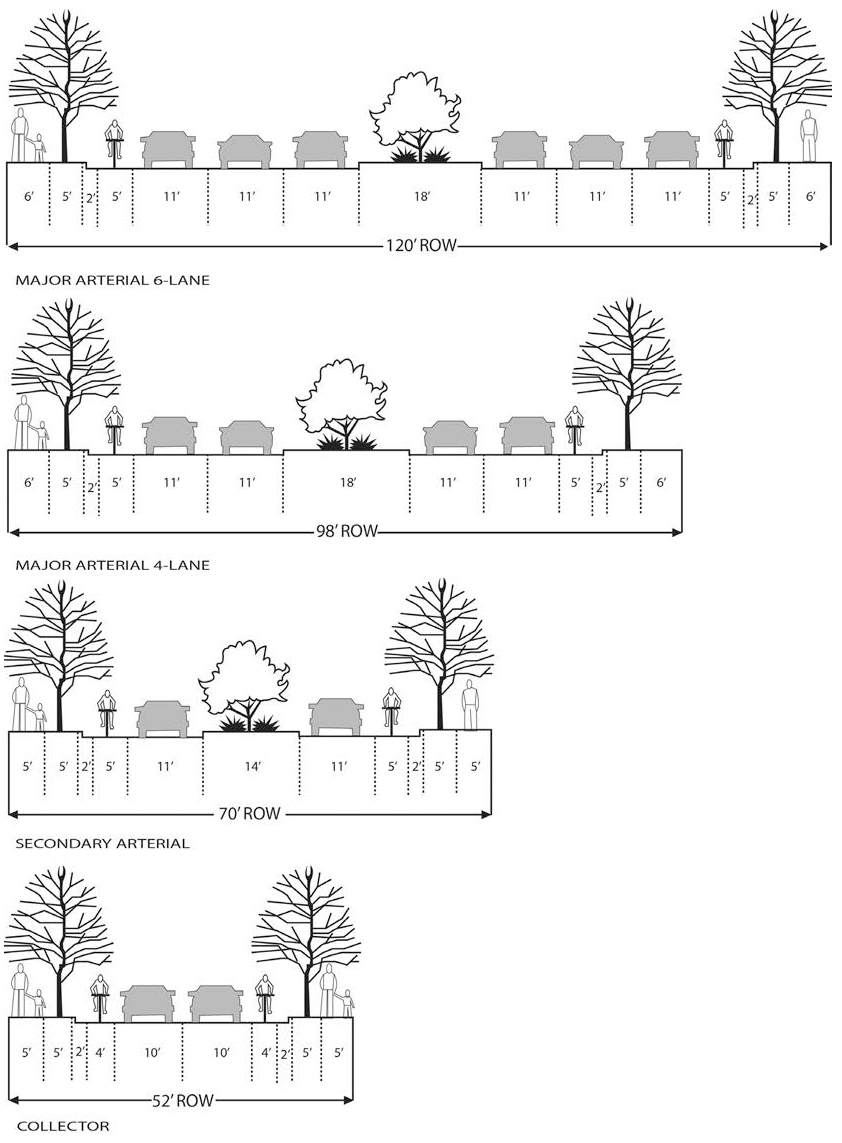 New public and private streets shall be constructed according to projected average daily traffic as shown in the street types-design criteria chart and Illustration 14-9.2-1, Street Types Design Criteria. The design criteria are intended to recognize that streets: