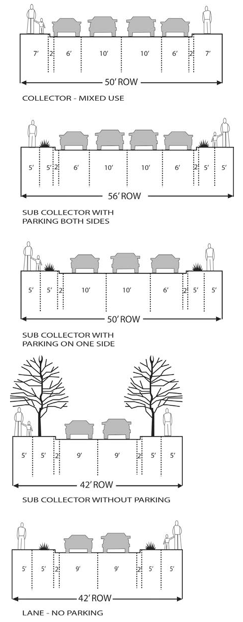 The collector mixed use street type is to be constructed in conjunction with the development of neighborhood centers and is designed to function like many of the streets near the plaza.