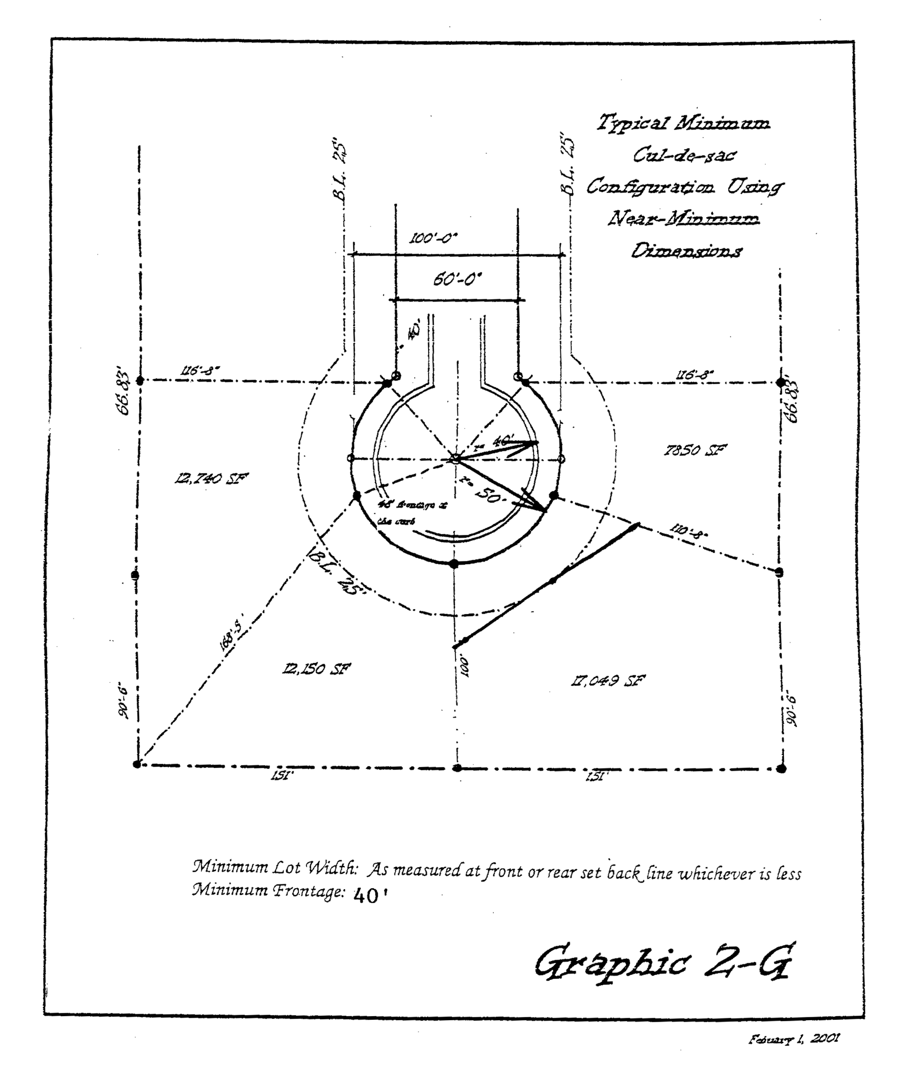 2.01.42.6 Cul-de-Sac Configuration: To allow for pie shaped lots that are narrower at the front than the back to be less than the minimum width at the front of the property line and to comply with the minimum lot width at the building line instead, (2) to allow for pie shaped lots with a front width greater than the rear width to be the minimum at the back yard rear building set back line, and (3) to require the minimum frontage at the street to be 40', as depicted on Graphic 2-G, attached hereto and marked as Exhibit "B."