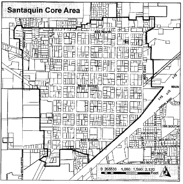CORE AREA: The central area of Santaquin City located within the following boundaries starting at the intersection of Main Street and Interstate 15; West to 450 East, then North to 550 North, thence west to Center Street, thence south to 400 North, thence west to 500 West, thence south to Main Street, thence east to 400 West, thence south to 550 South, thence east to Center Street, thence south to Interstate 15, thence along Interstate 15 to the point of beginning. This boundary is more fully illustrated in the following graphic titled Santaquin Core Area.
