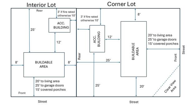 | Main Building | 25' to garage door 15' to living area 10' to covered porch | 25' to garage doors 15' living area | 5' | 25' |