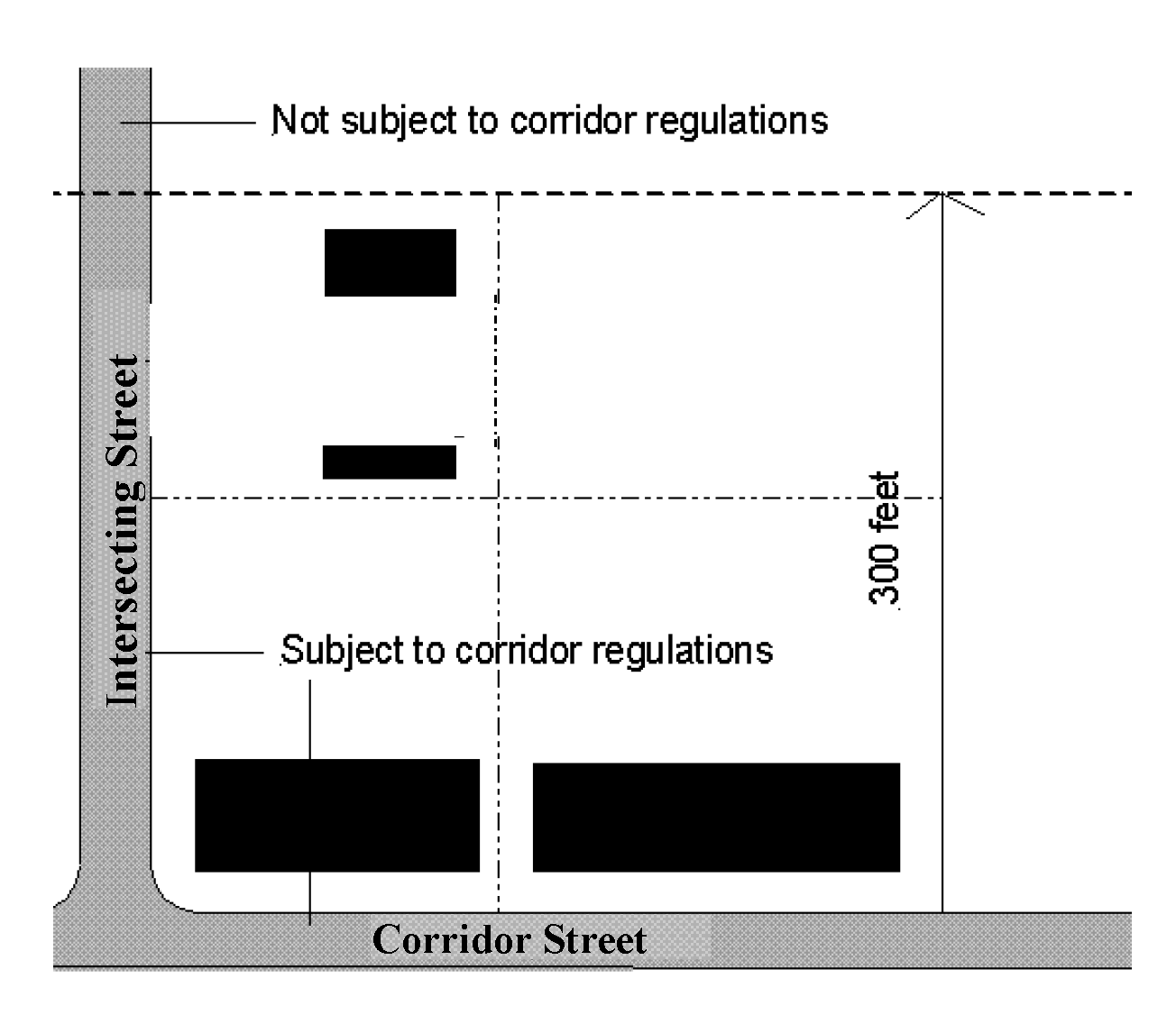 A street that intersects a designated Corridor Street is referred to as an Intersecting Street (see Figure 5-1).