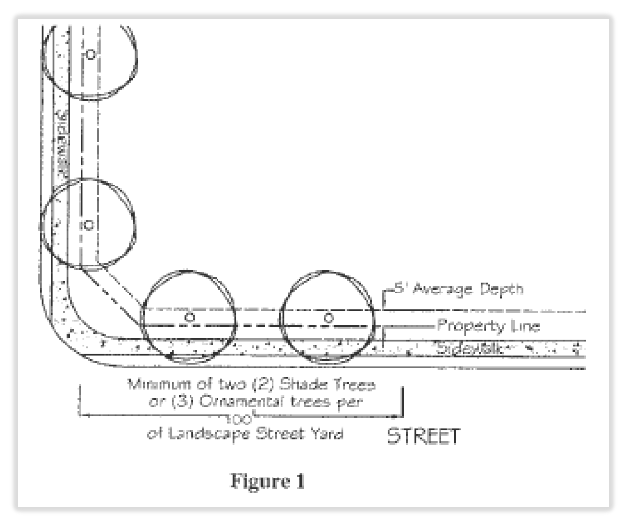 Landscape street yards shall average five (5) feet in depth, excluding walkways, measured perpendicular from the adjoining property/street right-of-way to the proposed back of curb or edge of pavement on subject property.