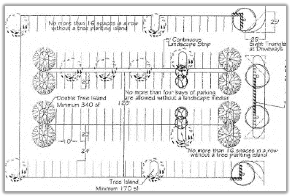 Interior parking lot landscaping. Trees shall be required to be planted in the interior of all lots over ten (10) spaces. No more than four (4) bays of parking (two aisles and four (4) bays = 128') shall be provided without a five (5) foot continuous median/landscaped strip. The landscaped strip shall be planted with canopy and ornamental trees and shrubs.