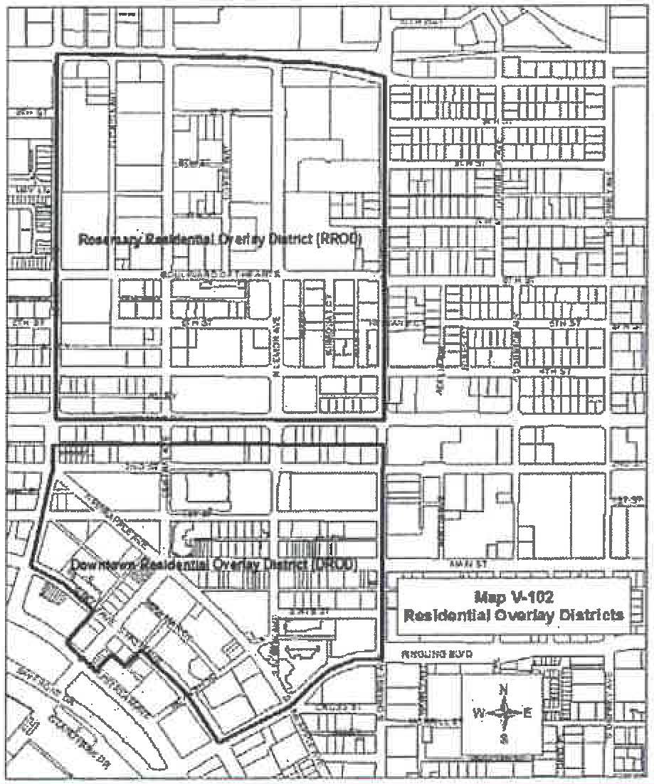 Structures built in accordance with a Downtown Residential Overlay District (DROD) or Rosemary Residential Overlay District (RROD) development approval. The DROD, with a maximum of 200 dwelling units per acre, and the RROD, with a maximum of up to 100 dwelling units per acre, allow for residential development at a greater density than the maximum allowed by the base zone district. See Map V-102.