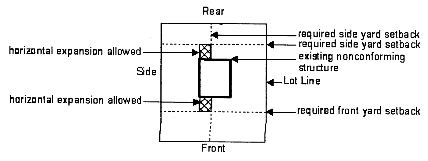 Structures with a nonconforming setback may be expanded, but only horizontally, along a line parallel to the existing nonconformity, provided all of the other zoning code requirements are met. This type of expansion is allowed in front, rear and side yards, however, this type of expansion is not allowed in waterfront yards. In residential zone districts, this type of expansion is not allowed where the existing setback is less than three feet. This subparagraph shall apply to one story structures which have a finished floor elevation which is no more than 24 inches above the average elevation of the crown of a dedicated public street abutting a front yard.