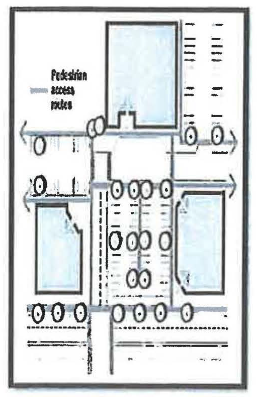 Where the system crosses driveways, parking areas and loading areas, the system must be clearly identifiable through the use of elevation changes, speed bumps, different paving materials, or other similar methods. Striping does not meet this requirement.