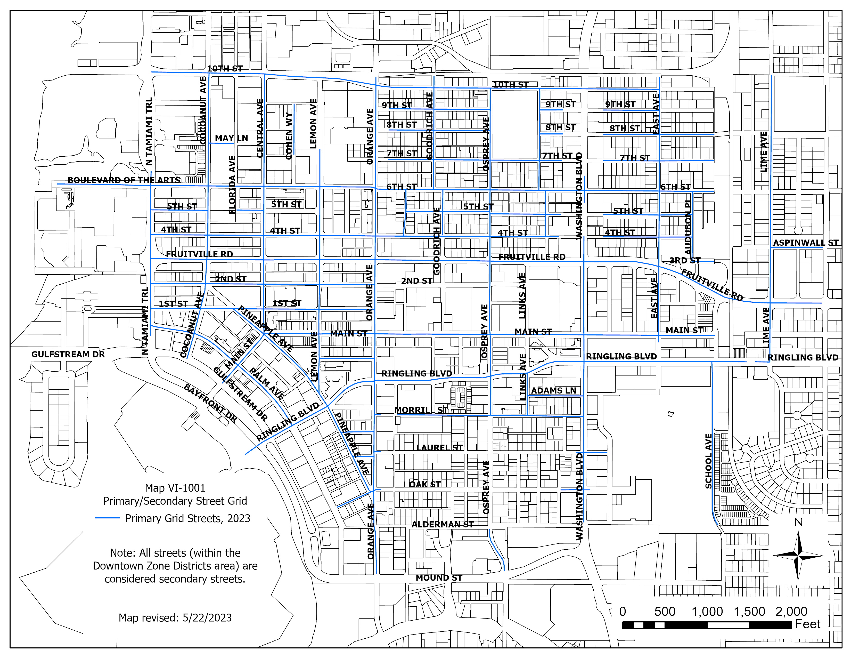The required design standards are stated in table VI-1004. These standards are limited to portions of buildings with frontages that face a primary street. Building frontages that face a secondary street are exempt from these standards. map VI-1001 identifies the primary and secondary street grid.