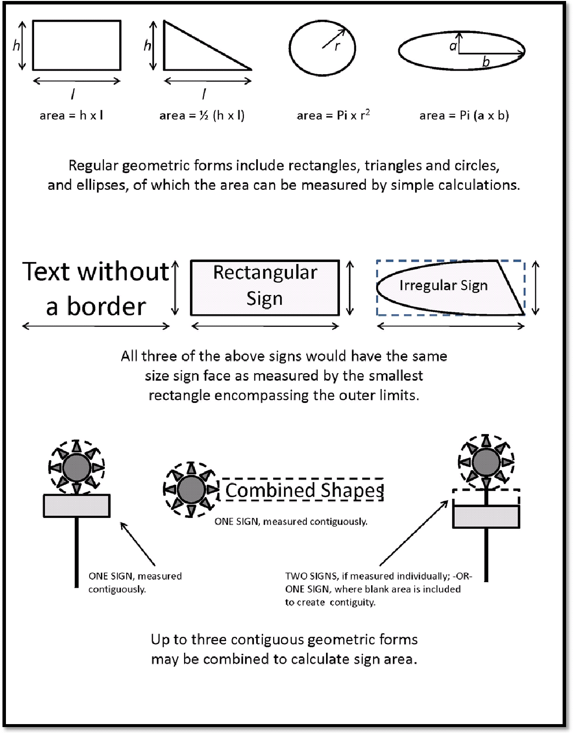Area. The surface area of a sign shall be the entire face of a sign, including any framing, trim or molding, but not including the supporting structure. Measurement shall be made based on the entire area within a regular geometric form including rectangles, circles, triangles and ellipses, or the cumulative combination of up to three such contiguous forms. In the case of double-faced signs, each sign face shall be included for the purpose of determining the total aggregate area of the sign.