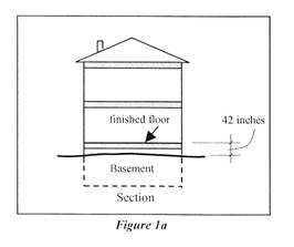 "Basement" means a space in a structure that is partly or wholly below grade and where the vertical distance from grade to a finished floor directly above such space is less than or equal to forty-two inches. (See Figure 1a) If the finished floor directly above the space is more than forty-two inches above grade at any point along the perimeter, such space shall be considered a story, and the entire space shall be included in the calculation of floor area. This requirement applies to all lots, with the exception of hillside lots.