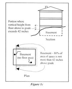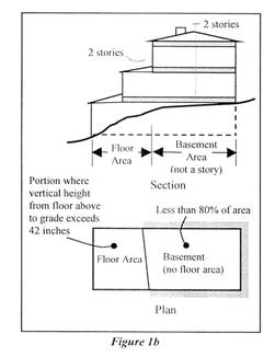 On hillside lots, as defined in Section 15-06.420(e), only the portion of space where the vertical distance of the finished floor directly above such space is more than forty-two inches above grade shall be counted as floor area and considered a story. The number of stories measured vertically at any given point shall not exceed the maximum number of stories allowed in each zoning district. (See Figure 1b) However, if the vertical distance of the finished floor above the space is not more than forty-two inches above grade for at least eighty percent of area of such space, then the entire space is a basement that shall not be included in the calculation of gross floor area and shall not be considered a story. (See Figure 1c.)