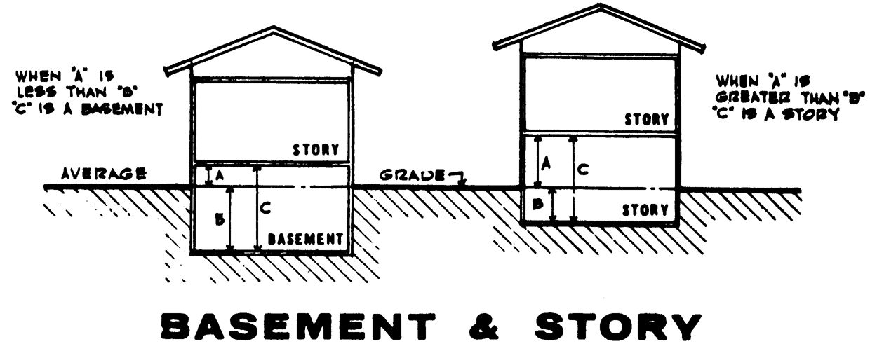 Basement: Is that portion of a building which is partly, or wholly below grade but so located that the vertical distance from average grade to the floor is greater than the vertical distance from the average grade to the ceiling. If the vertical distance from the grade to the ceiling is over five (5) feet, such basement shall be rated as a first story.