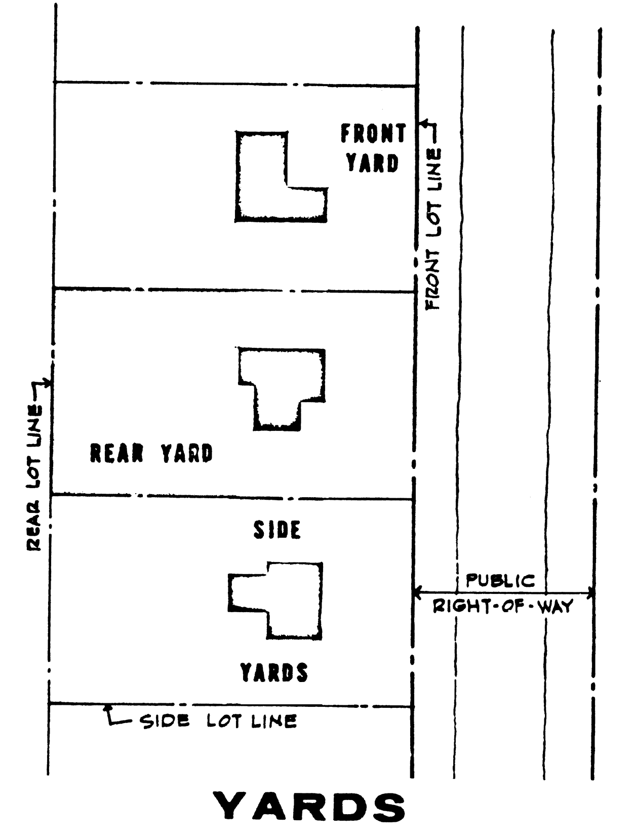 Yards: The open spaces on the same lot with a main building or main use, unoccupied and unobstructed from the ground upward except as otherwise provided in this Ordinance, and as defined herein: