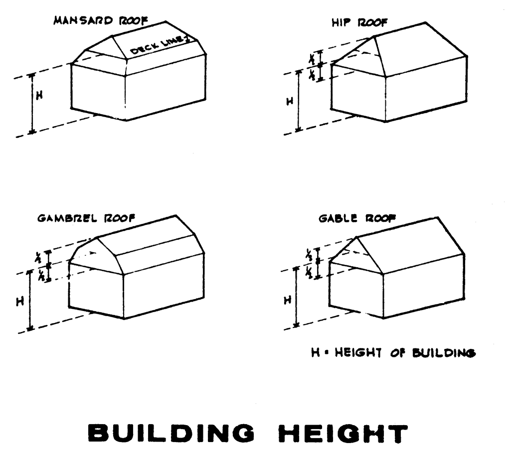 Building height: Is the vertical distance measured from the established grade of the center of the front of the building to the highest point of the roof surface for flat roofs; to the deck line of mansard roofs; and to the average height between eaves and ridge for gable, hip, and gambrel roofs; and the average height between the lowest point and the highest point on a shed roof. Where a building is located on sloping terrain, the height may be measured from the average ground level of the grade at the building wall.