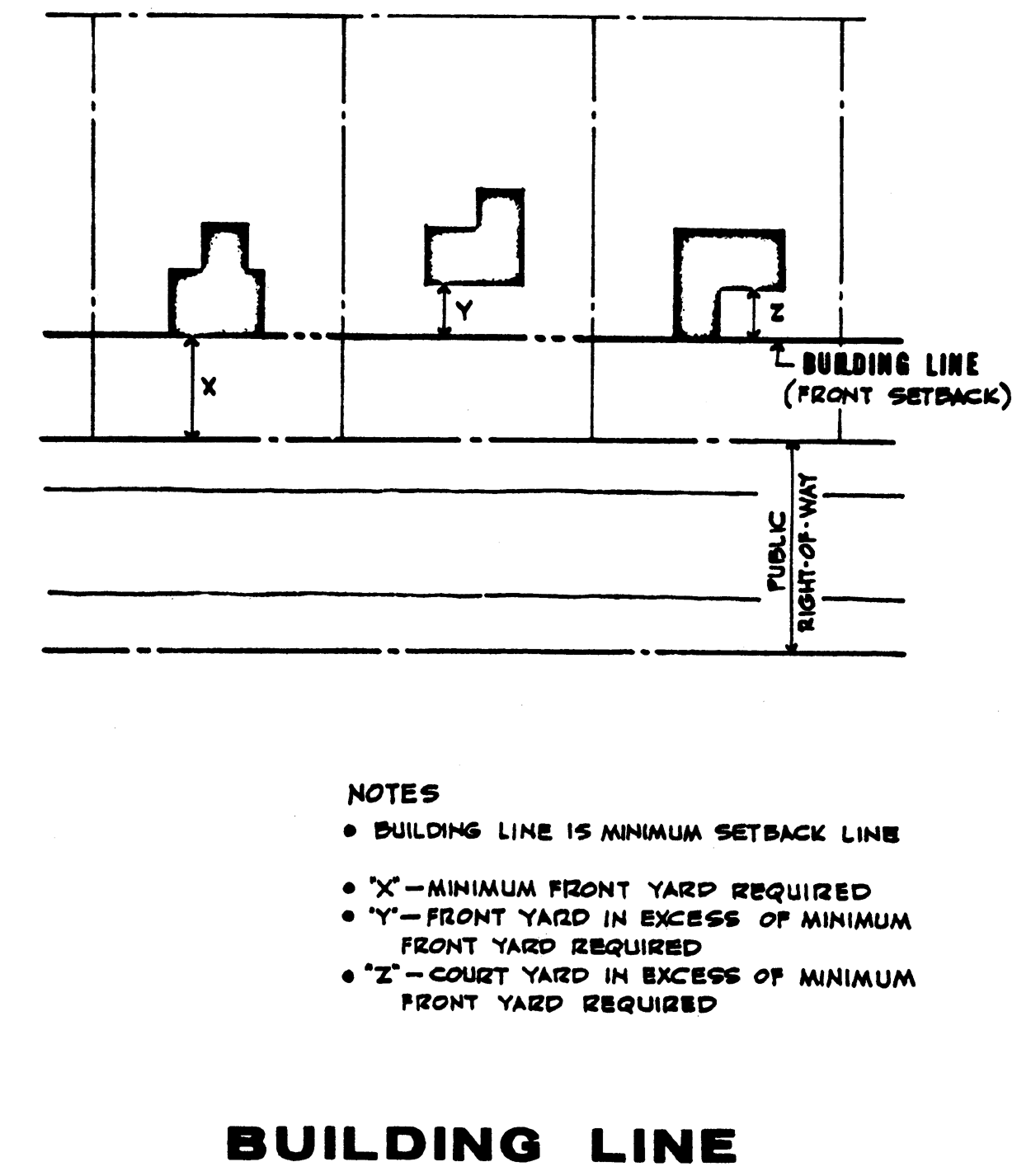 Building line: Is a line formed by the face of the building, and for the purposes of this Ordinance, a building line is the same as a front setback line.