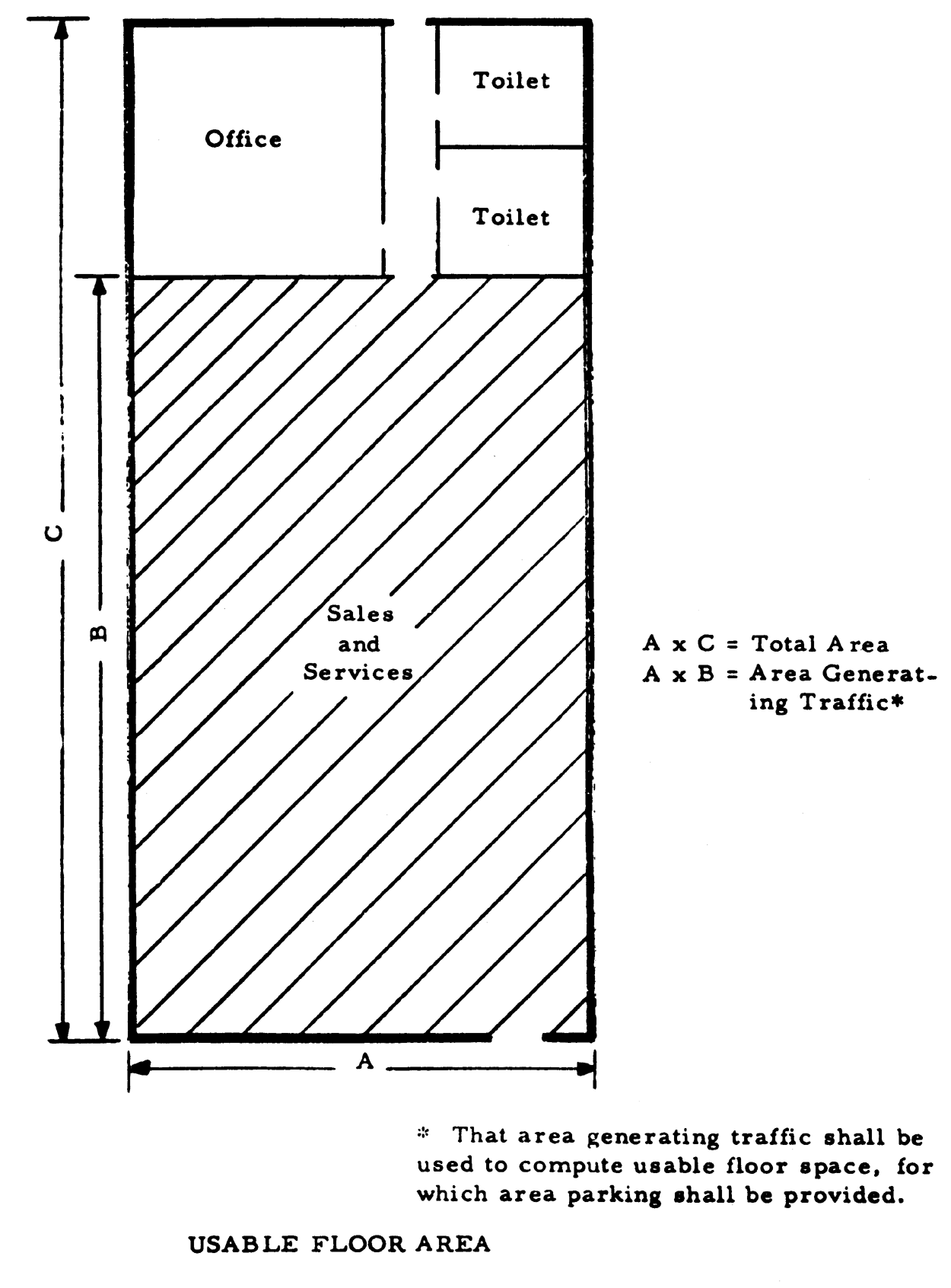 Floor areas, usable: (For the purposes of computing parking) Is that area used for, or intended to be used for, the sale of merchandise or services or for use to serve patrons, clients, or customers. Such floor area which is used or intended to be used principally for the storage or processing of merchandise, or for utilities, shall be excluded from this computation of "Usable Floor Area." Measurements of floor area shall be the sum of the gross horizontal areas of the several floors of the building measured from the interior faces of the exterior walls. For the purposes of computing parking for those uses not enclosed within a building, the area used for the sale of merchandise, display of merchandise, and/or area used to serve patrons or clients shall be measured to determine necessary parking spaces.