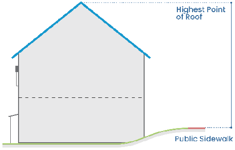 "Building height" means vertical distance measured from the level of the public sidewalk, or the top of the curb if there is no sidewalk or the centerline of the road if there is no sidewalk and no curb, opposite the middle of the front of the building to the highest point of the roof.