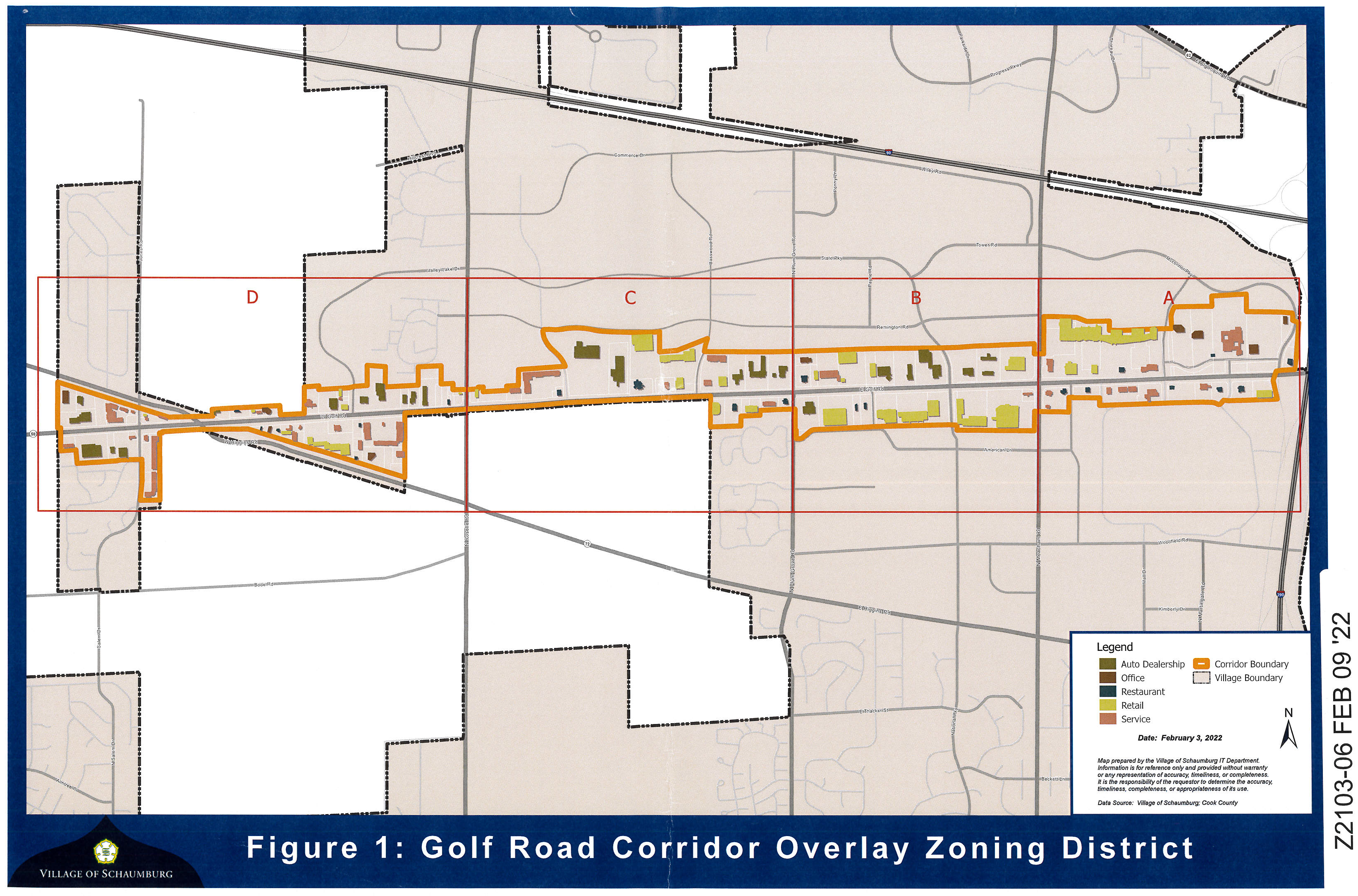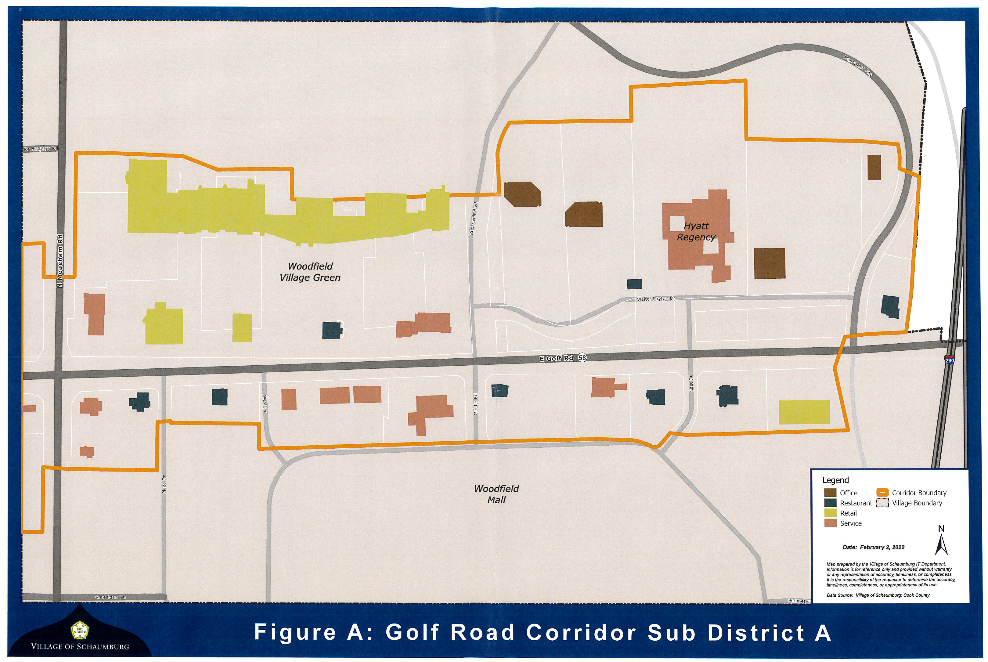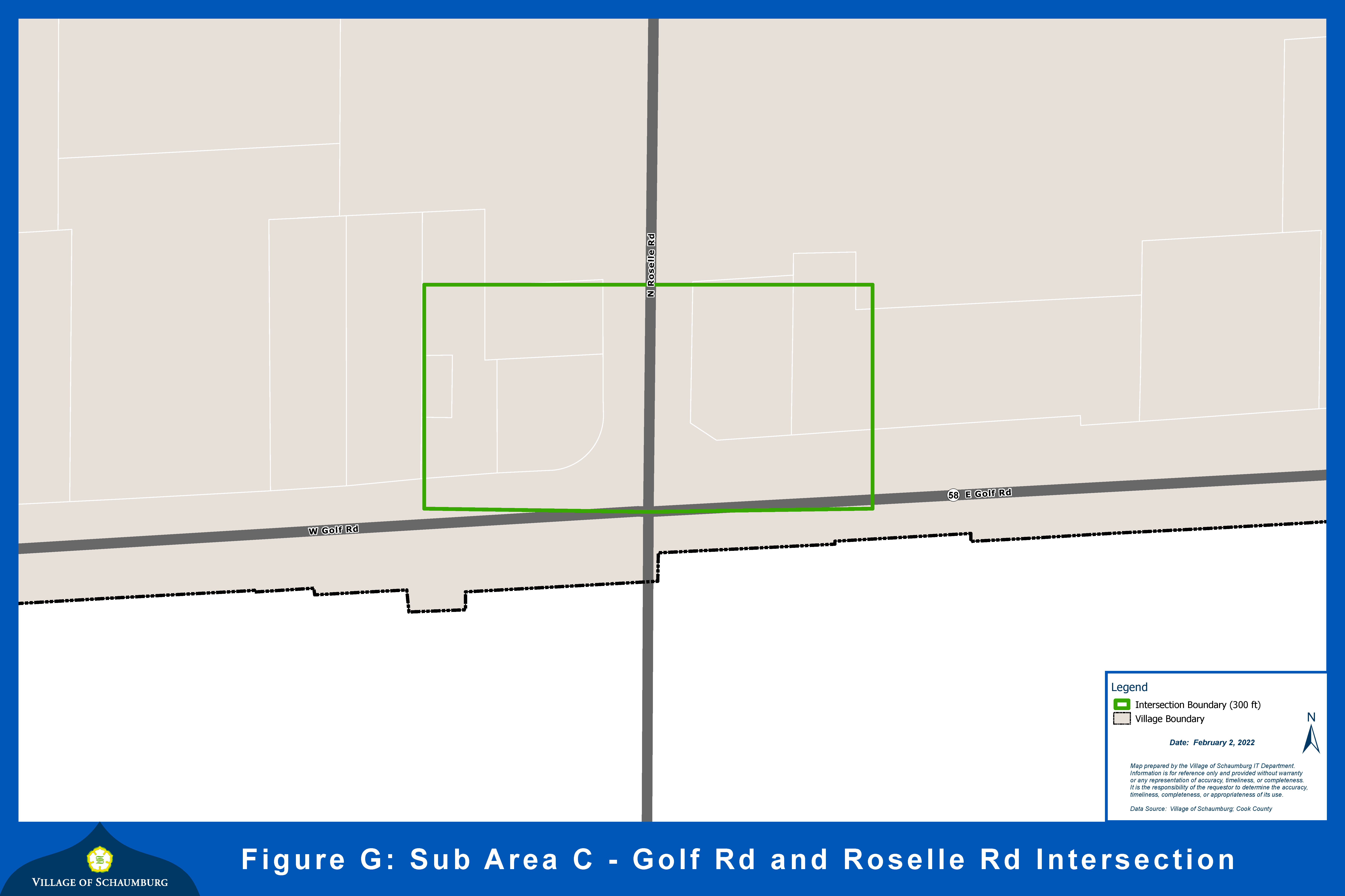 Boundaries: The Golf Road Corridor Overlay District boundaries are shown on the map in Figure 1. The geography of the corridor includes all properties located along Golf Road, east of Stonehedge Drive and west of Interstate 290/Illinois Route 53. In addition, Figures A through D represent each of the four (4) sub-districts within the corridor and Figures E through G represents each of the three (3) key corner intersections.