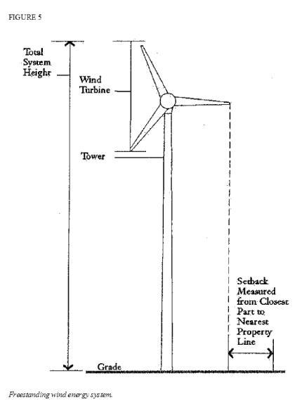 Setback: All parts of the freestanding system (tower, rotor blades, etc.), shall be located a minimum of ten feet (10') from all property lines and not in a public utility easement.