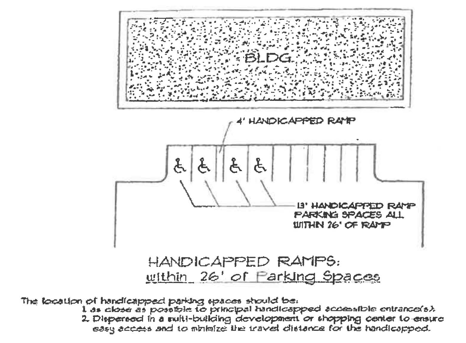 The number and size of the handicap parking spaces required must follow the Federal Americans with Disabilities Act and Texas Accessibility Standards. The number of handicap parking spaces required is based on the total number of spaces provided. Accessible spaces for cars must have at least a sixty inch (60") wide access aisle located adjacent to the designated parking space. Van parking spaces need to have a wider access aisle of ninety-six inches (96") to accommodate a wheelchair lift and vertical clearance to accommodate van height.