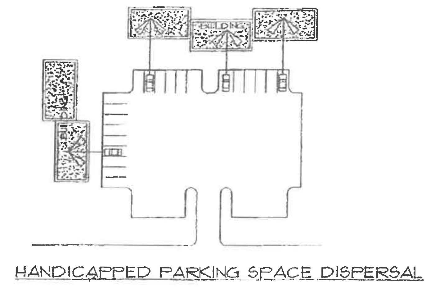Accessible parking spaces may be clustered in one or more lots if equivalent or greater accessibility is provided in terms of distance from the accessible entrance, parking fees, and convenience. Van-accessible parking spaces located in parking garages may be clustered on one floor (to accommodate the ninety-eight inch (98") minimum vertical height requirement).