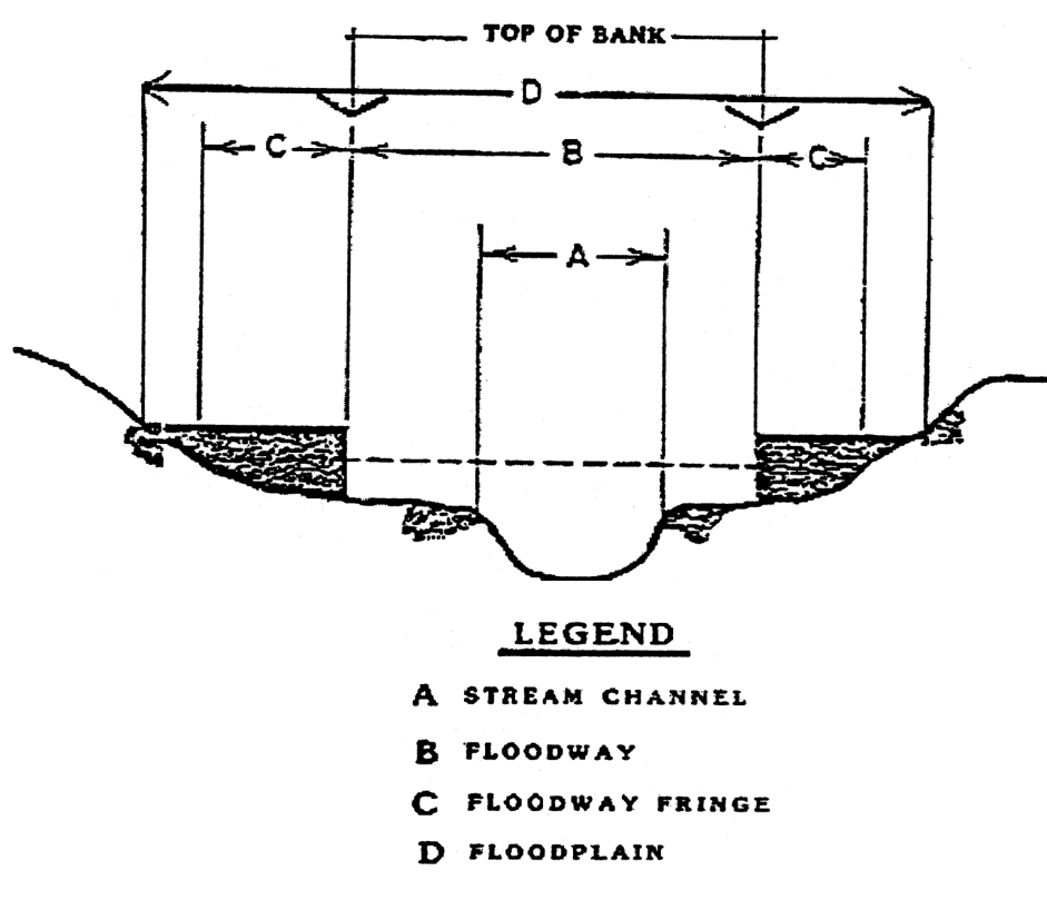 "Top of bank" means the edge of the floodway as depicted in Figure 17.04.230. Within the area formed by the edges of a floodway shall lie a stream channel and the portions of the adjacent hundred-year flood plain as required to efficiently carry the flood flows of the stream. This area includes areas A and B as shown on the diagram in Figure 17.04.230. This definition is not intended to be used to define a bank-to-bank easement or offer of dedication for open space and drainage or any other purpose in other ordinances of the city or other titles of this code. "Top of bank" is defined only for purposes of the zoning ordinance codified in this title.