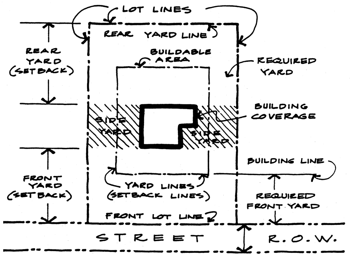 "Setback" means the distance between the existing or planned right-of-way line or property line and a building or any projection thereof, excluding uncovered steps.