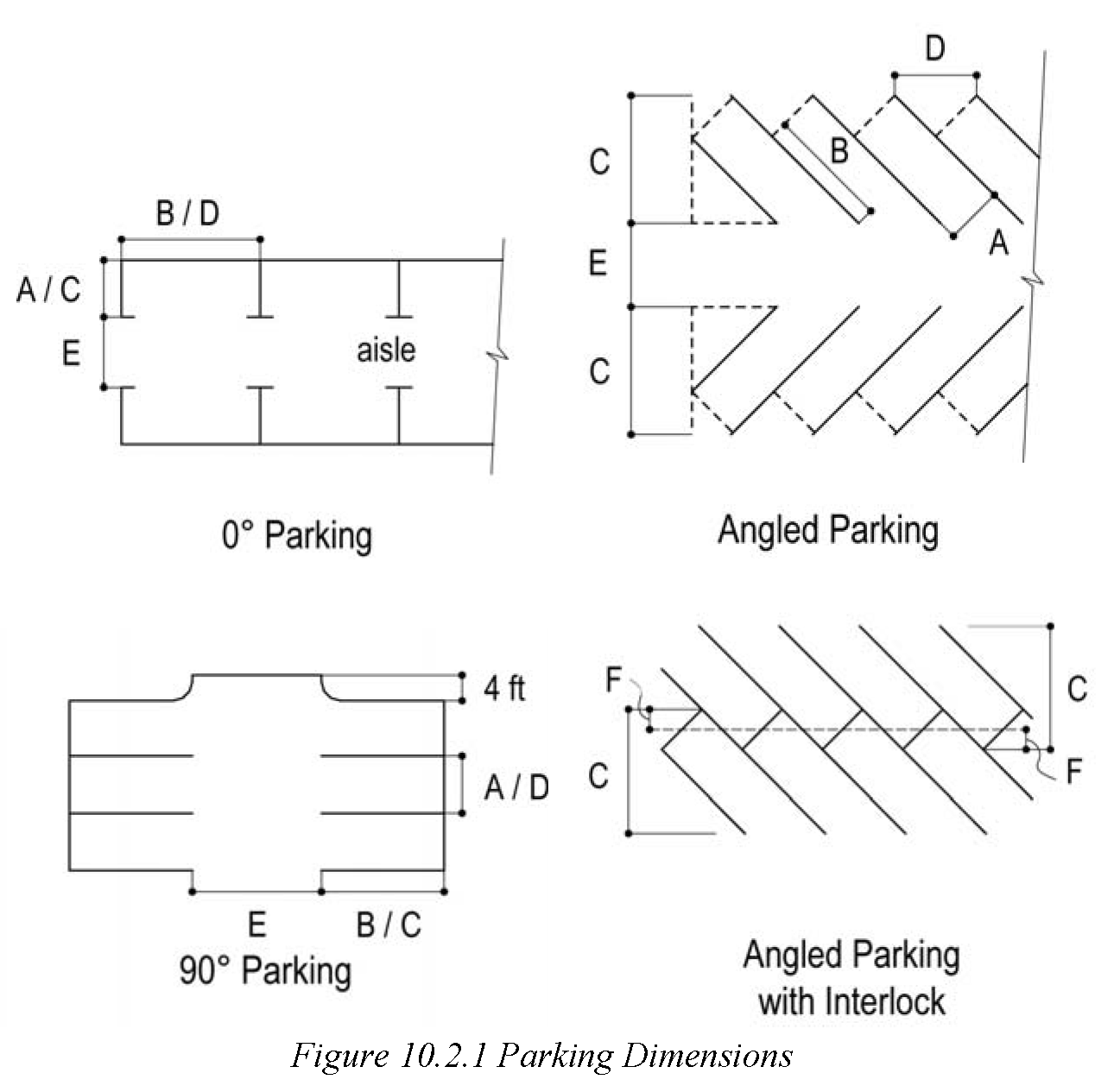 The minimum parking space dimensions shall be as shown in table 10-2 and figure 10.2.2.