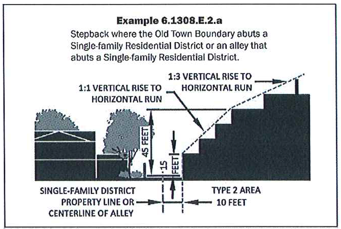 Where the Old Town Boundary abuts a Single-family Residential District or an alley that abuts a Single-family Residential District, the stepback plane shall incline at a ratio of 1:1, beginning fifteen (15) feet above the setback line to forty-five (45) feet; and beginning at forty-five (45) feet, incline at a ratio of 1:3.