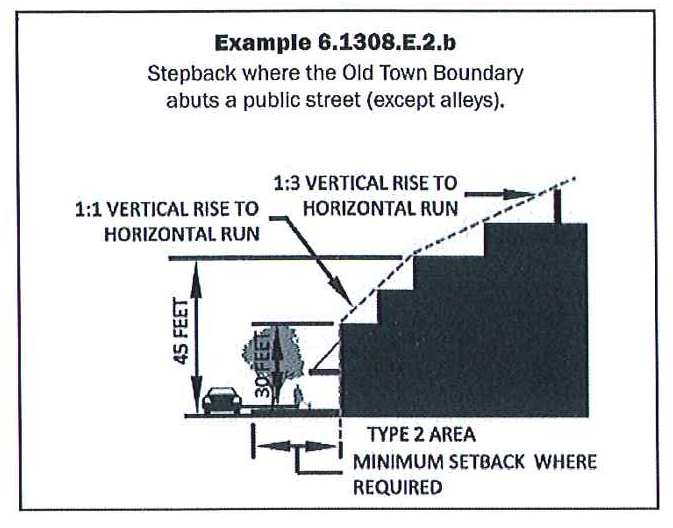 Where the Old Town Boundary abuts a public street (except alleys), the stepback plane shall incline at a ratio of 1:1, beginning thirty (30) feet above the minimum setback from the public street (except alleys) to forty-five (45) feet; and beginning at forty-five (45) feet, incline at a ratio of 1:3.