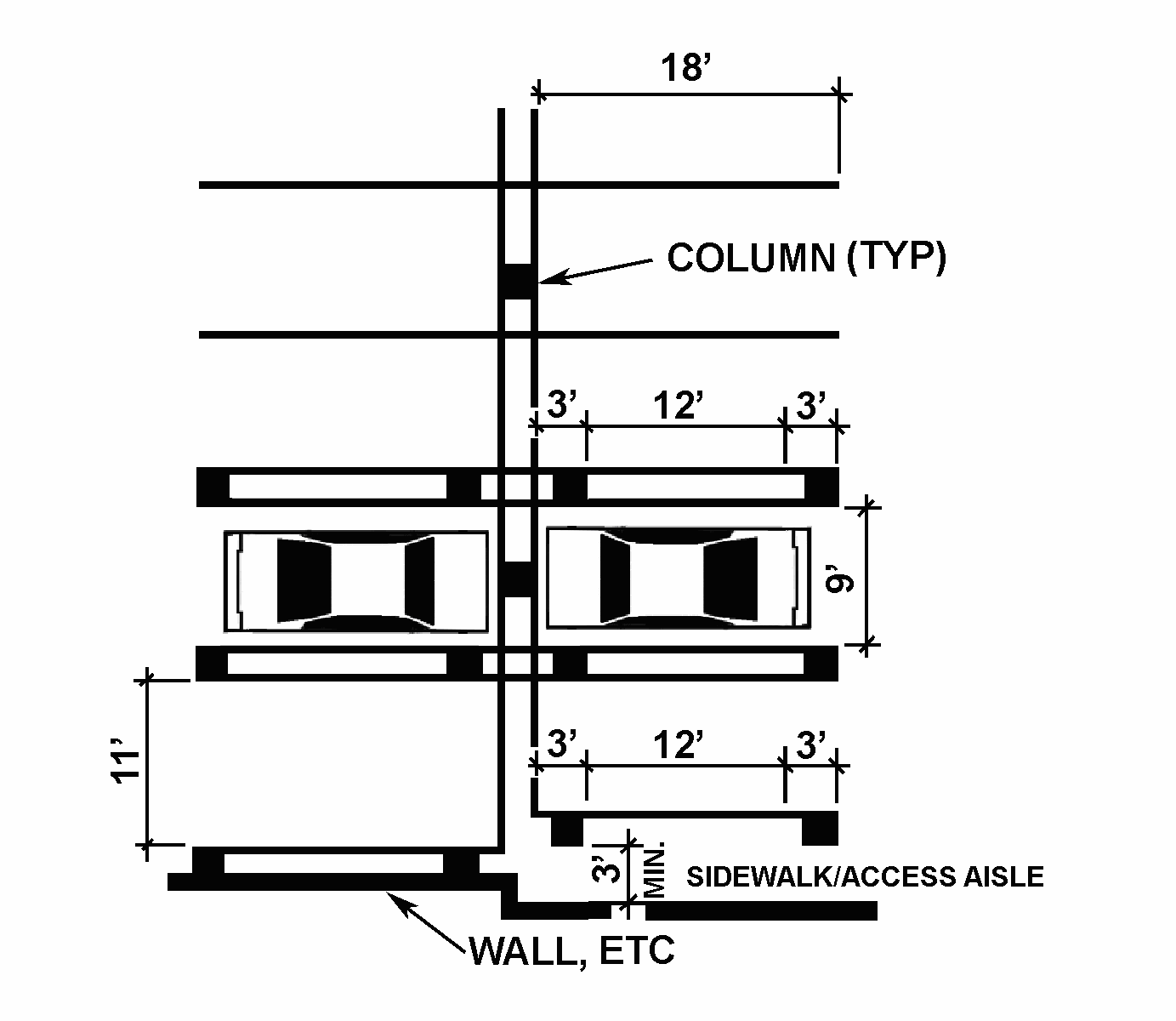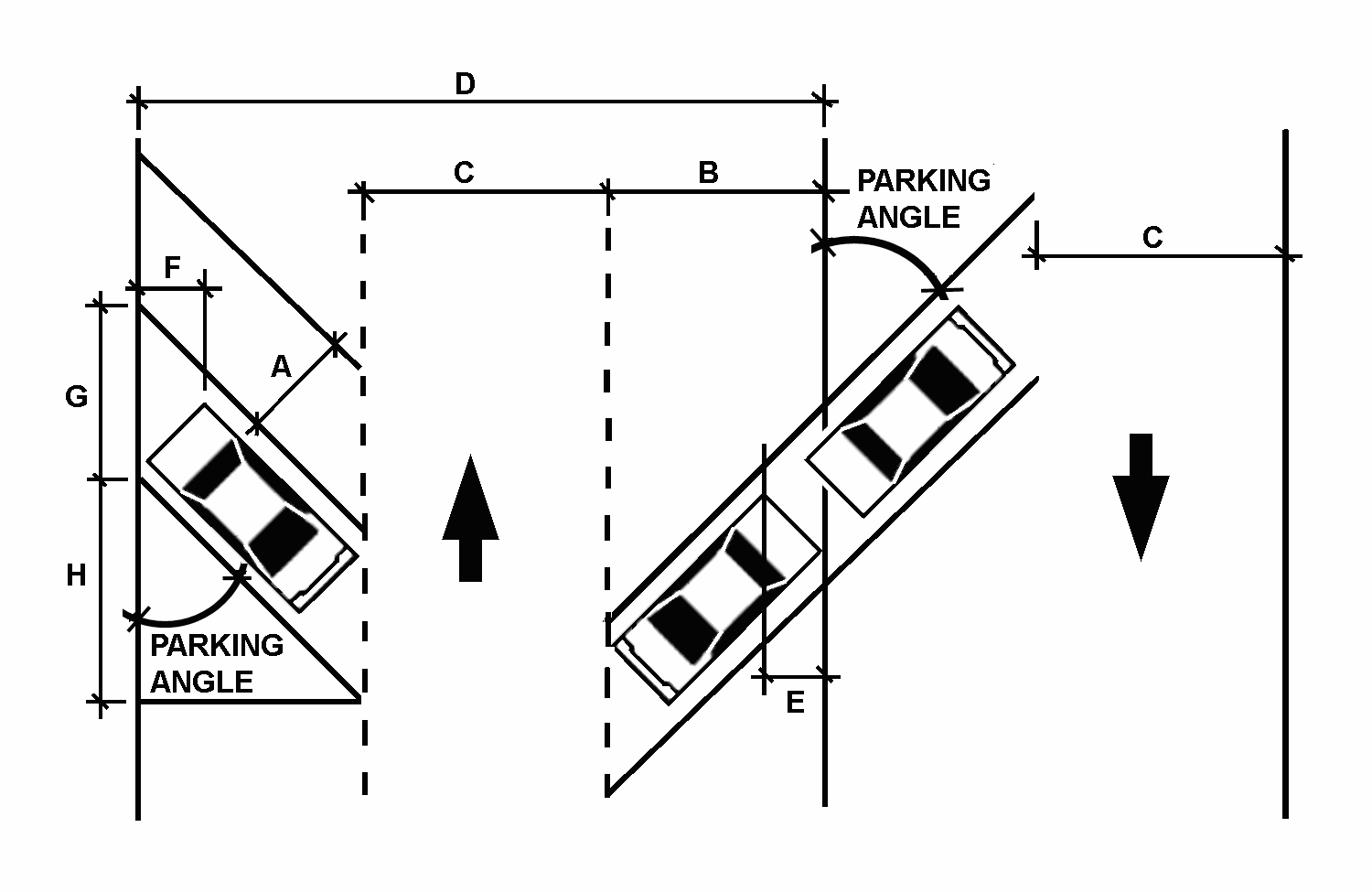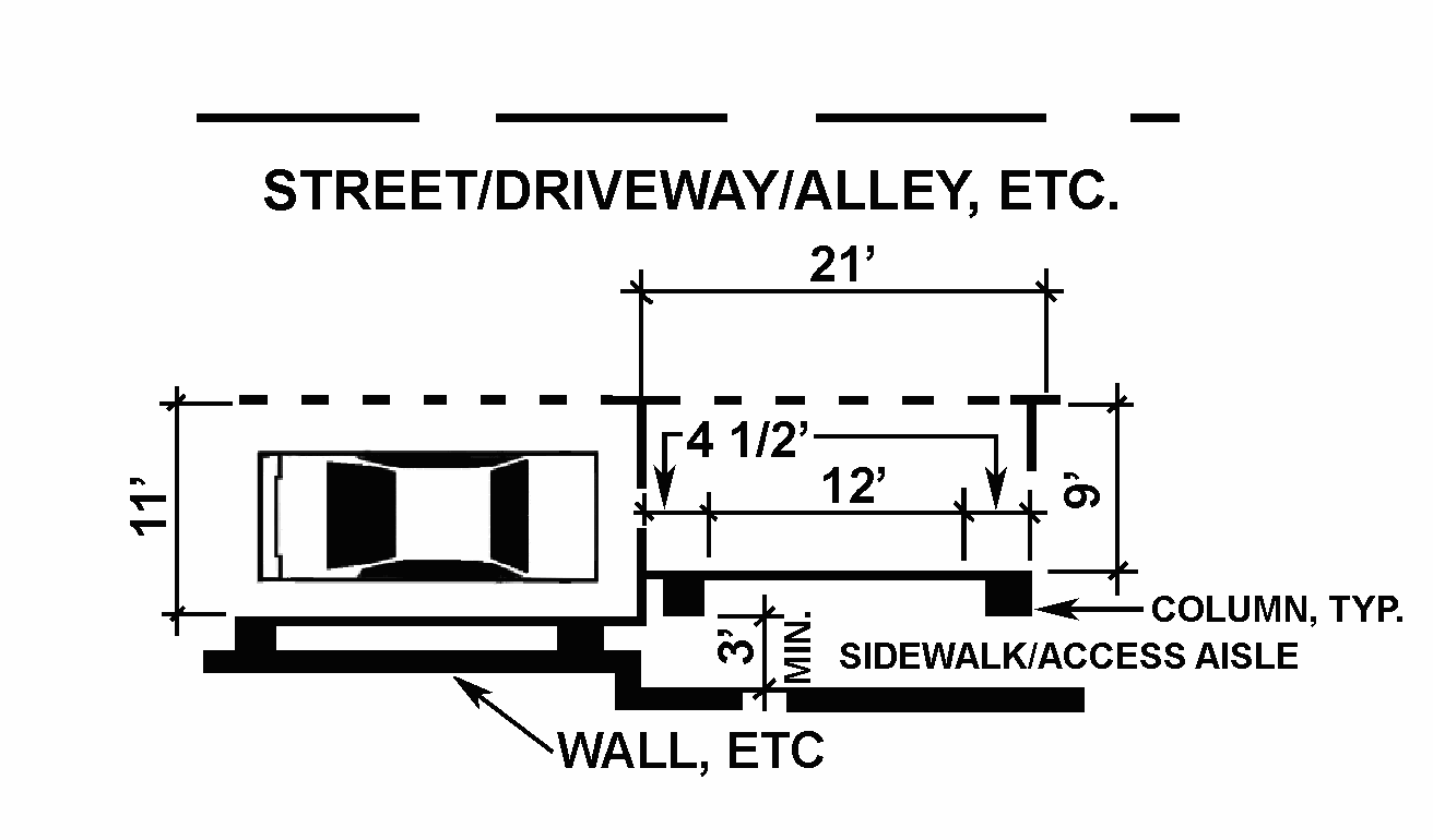 Parking layout. Minimum layout dimensions are established in Table 9.106.A. and Figure 9.106.D. which shall apply to all off-street parking areas with the exception that parking spaces accessed by an alley shall require a minimum of ten (10) feet from the back of the space to the alley centerline.