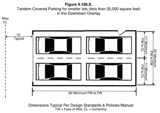 Residential parking space may be provided in a two (2) parking space tandem configuration if the tandem spaces are allocated to the same residential dwelling. Tandem parking spaces shall be accessed directly from a drive aisle, alley or driveway.