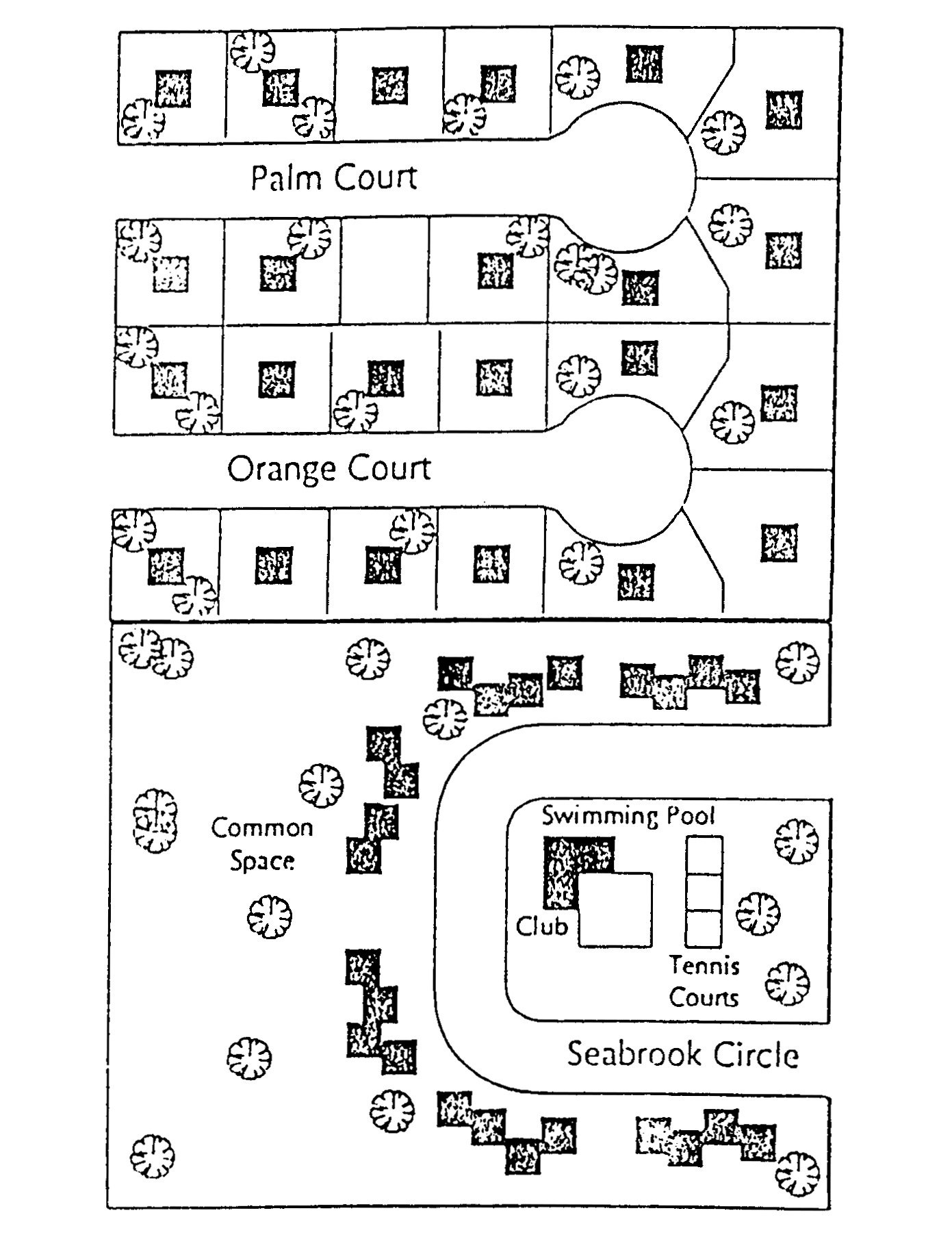 The bottom half of the illustration shows a planned unit, design. It incorporates the same dwelling unit density as the traditional design shown on top. Private yards are exchanged for open spaces and on-site amenities which often include recreational facilities.