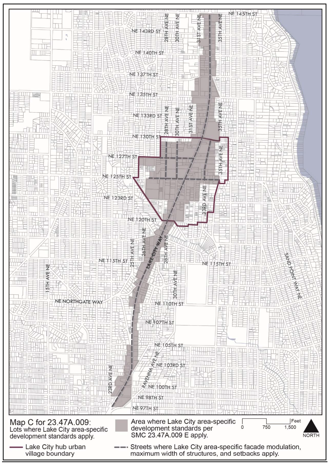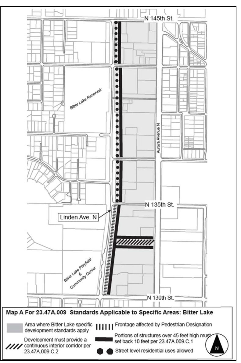 In all NC and C1 zones within the Bitter Lake Village Hub Urban Village, except lots abutting Linden Avenue North, north of North 135th Street; or