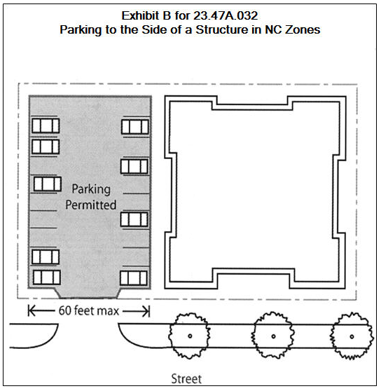 Parking to the side of a structure shall not exceed 60 feet of street frontage (Exhibit B for 23.47A.032).