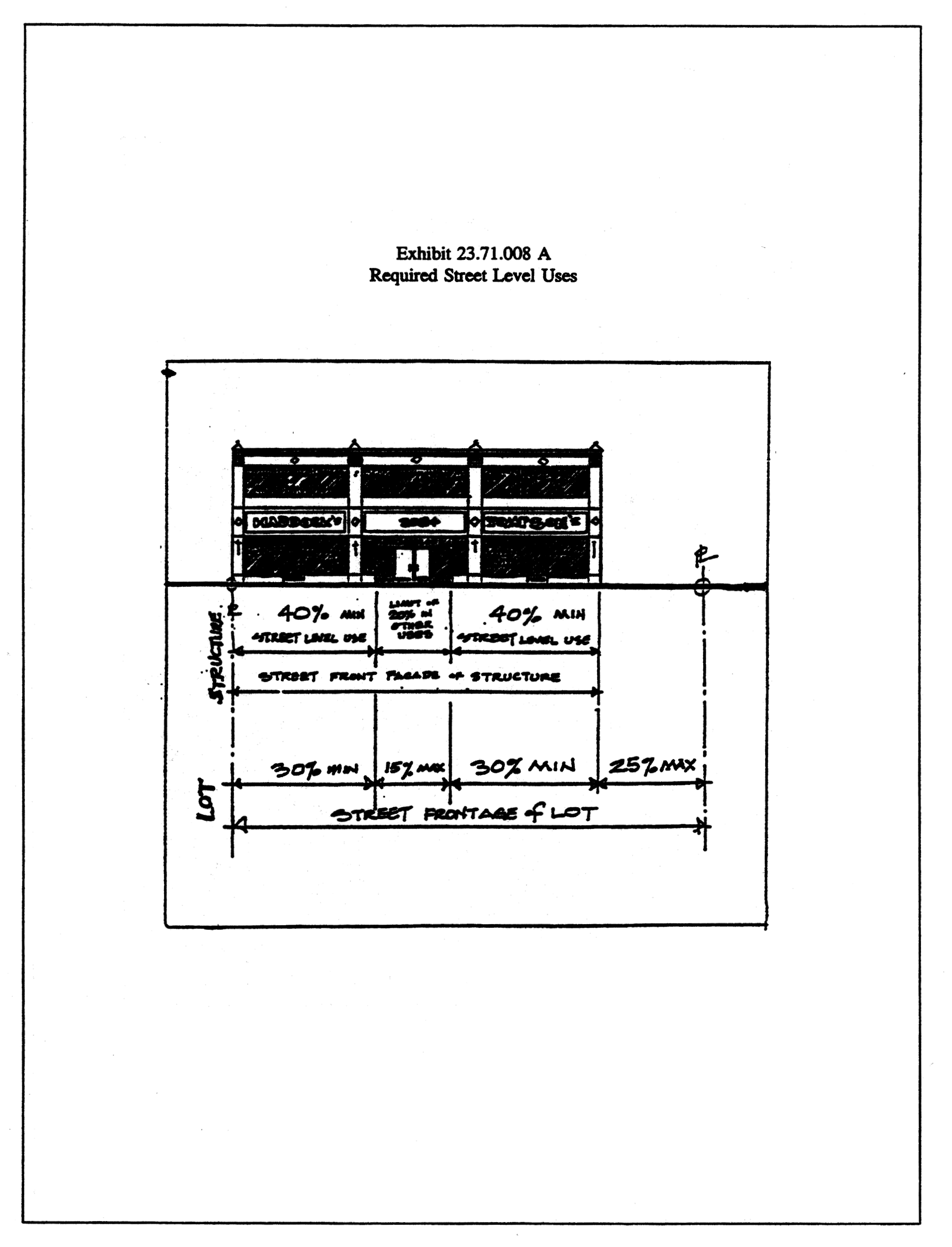 A minimum of 80 percent of each structure fronting on a major pedestrian street must be occupied at street level by required street-level uses or a building lobby permitting access to uses above or behind street-front uses. In no case may pedestrian access to uses above or behind required street-front uses exceed 20 percent of the structure's major pedestrian street front. The remaining 20 percent of the structure's street frontage may contain other permitted uses or pedestrian entrances (Exhibit 23.71.008 A).