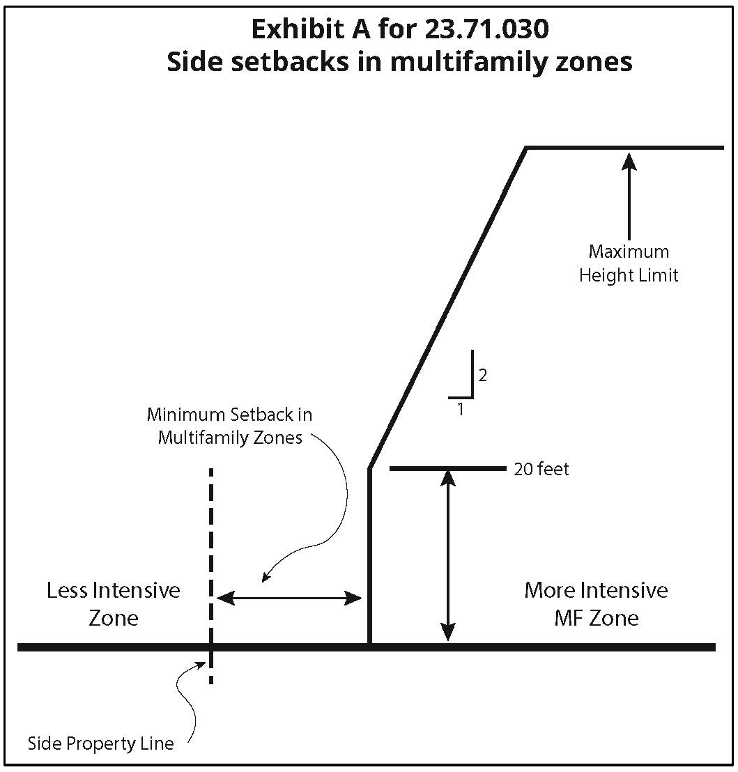 For structures in multifamily zones, an additional side setback of 1 foot for each 2 feet of a structure height above 20 feet is required (Exhibit A for 23.71.030).