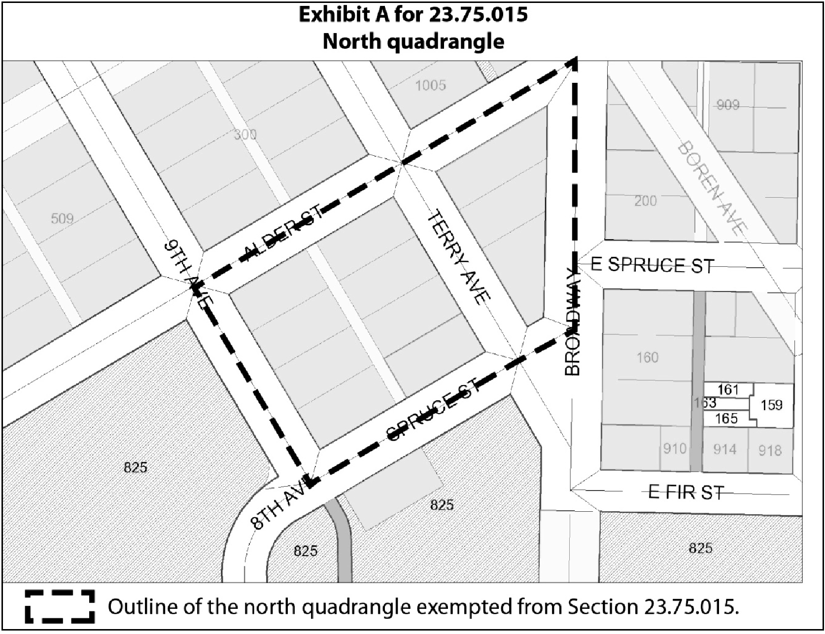 the land identified as the north quadrangle in Exhibit A for 23.75.015, for which the whole of this Chapter 23.75 except for this Section 23.75.015 will apply on and following the effective date of this ordinance; and