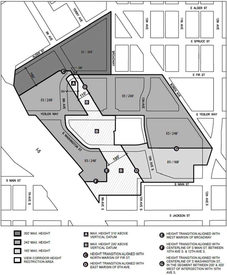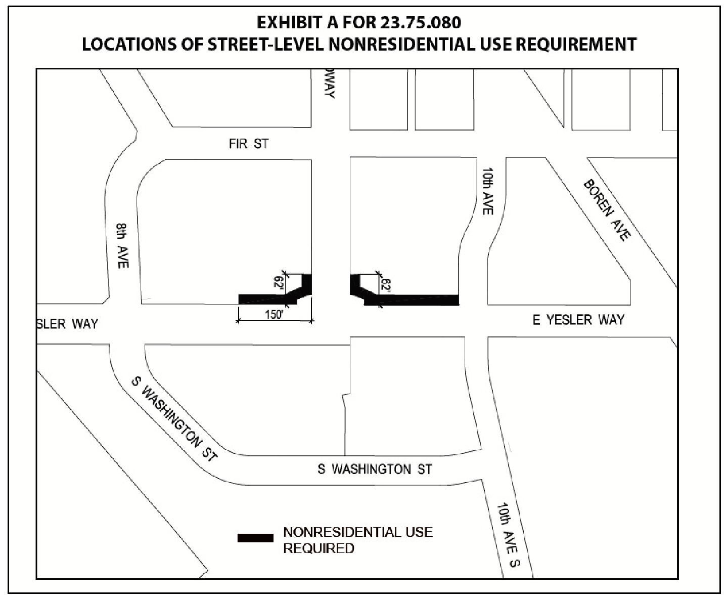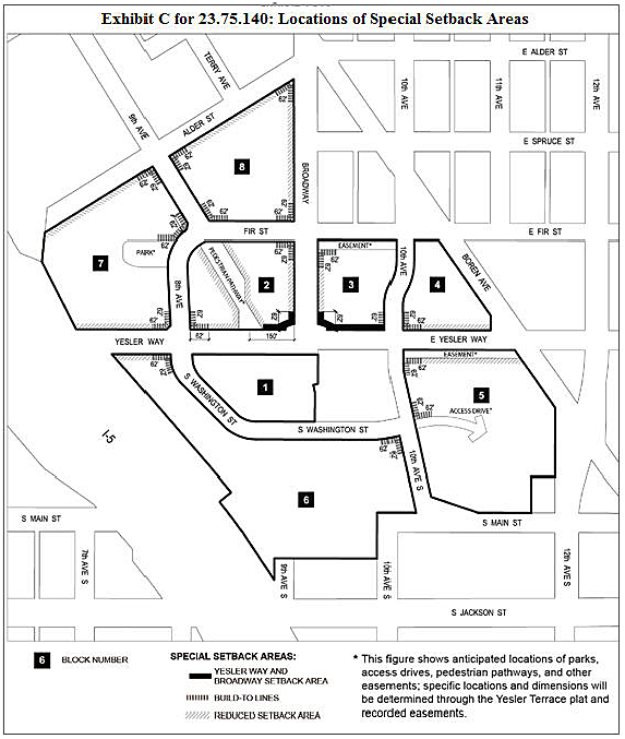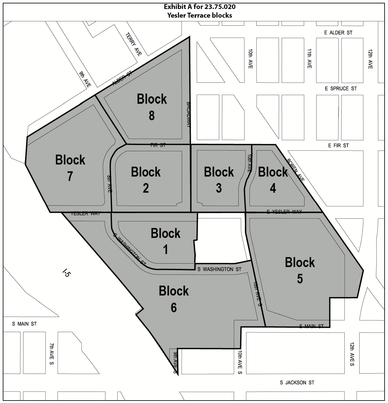 "Block" means one of the areas identified with a block number in Exhibit A for 23.75.020. Block margins align with the margins of the MPC-YT zone; with street centerlines of Yesler Way, E. Yesler Way, Broadway, 8 th Ave., 9 th Ave., and 10 th Ave; the centerline of E. Fir Street projected westerly from Broadway, as shown; the centerline of S. Washington Street, as shown; and the centerline of 10 th Ave S., between E. Yesler Way and S. Main St., as shown.