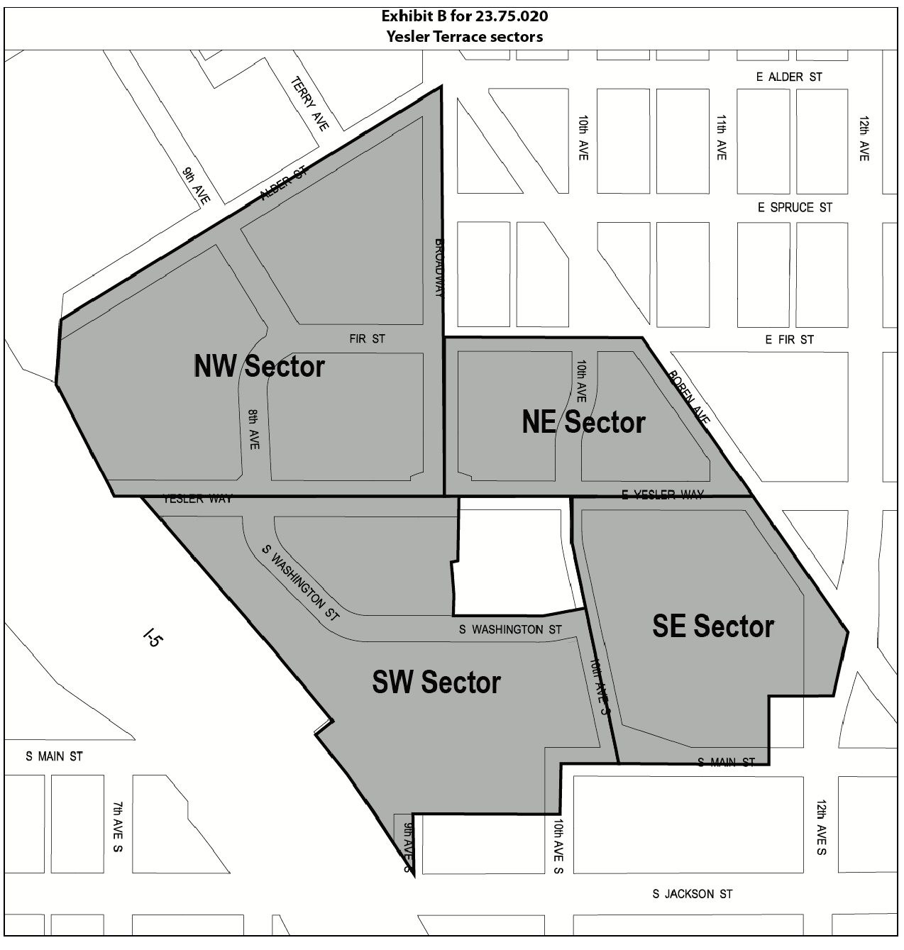 "Sector" means one of the areas identified in Exhibit B for 23.75.020. Sector margins align with the margins of the MPC-YT zone, with street centerlines of Yesler Way, E. Yesler Way and Broadway, as shown, and with the border between Block 5 and Block 6.