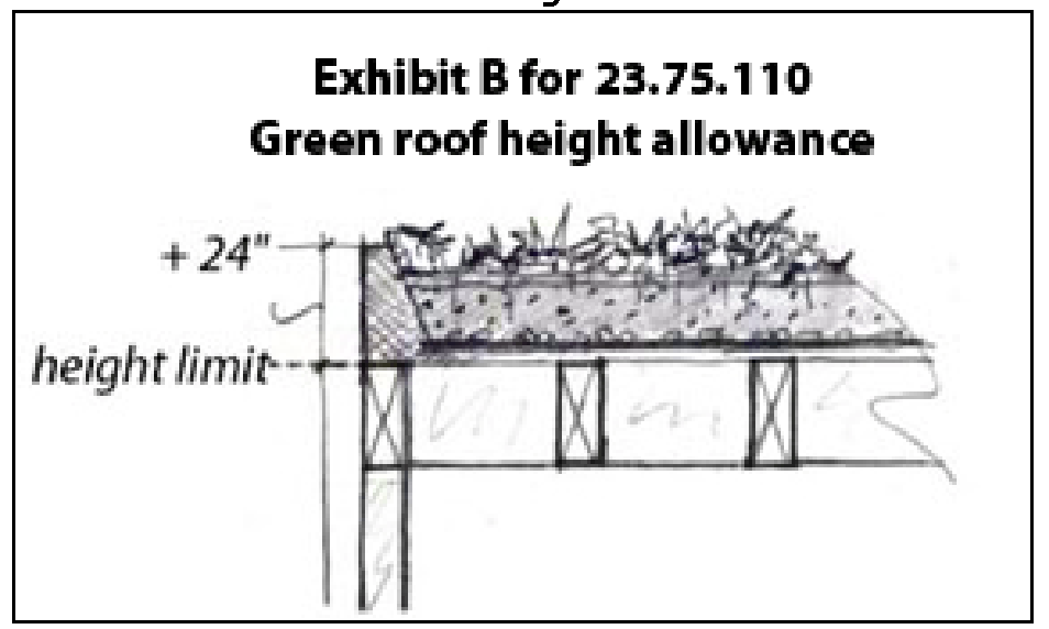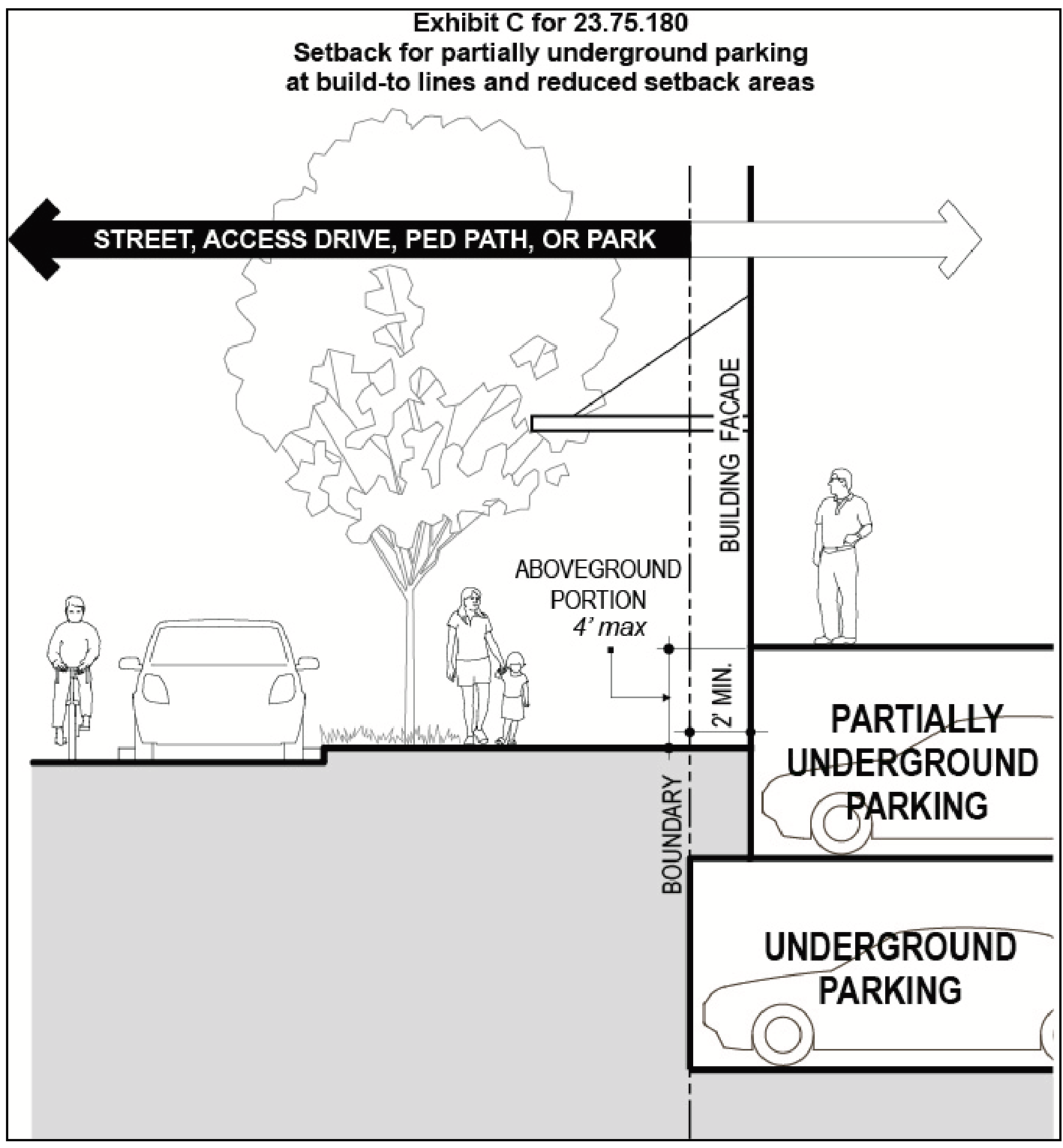 At build-to lines and in reduced setback areas as depicted in Exhibit C for 23.75.140, partially underground parking is required to be set back at least 2 feet from the boundary, as shown in Exhibit C for 23.75.180. In these locations, the aboveground portion of the parking garage is not allowed to exceed 4 feet above finished grade.