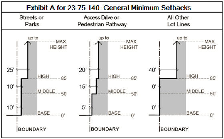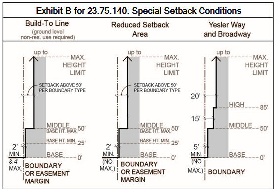 "Setback condition" for any location means the circumstance determining the setbacks that may be required under Section 23.75.140, including the type of special setback area or the type of boundary closest to a façade of a structure, as applicable.
