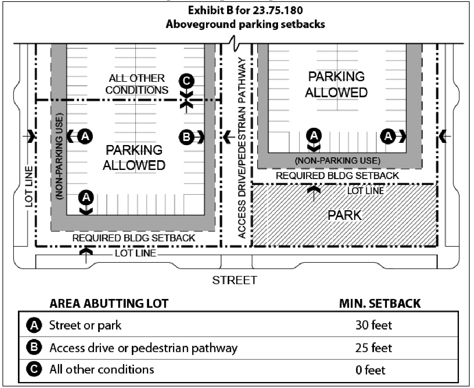 Minimum setbacks for aboveground parking are established in Exhibit B for 23.75.180. No parking setbacks are required from lot lines abutting the Interstate 5 right-of-way.