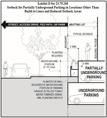 Along boundaries that abut a street, park that is open to the public, pedestrian pathway, or access drive and are not subject to a build-to line or reduced setback area, partially underground parking is required to be set back at least 4 feet from the boundary, as shown in Exhibit D for 23.75.180, and must meet the following standards: