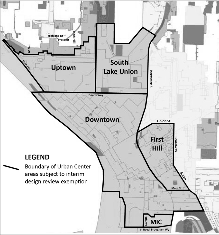 The proposal is located on a property within the Downtown Urban Center, Uptown Urban Center, South Lake Union Urban Center, First Hill Urban Center, or an area within the Greater Duwamish Manufacturing and Industrial Center, as shown on Map A for 23.41.004; or within an area included in an adopted expansion area of an urban center or manufacturing and industrial center shown on Map A for 23.41.004; and