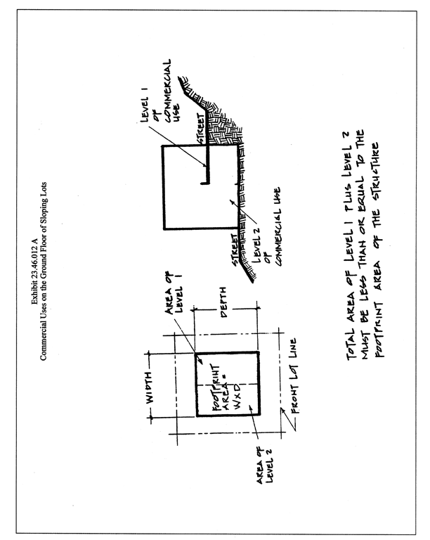 On sloping lots the commercial use may be located at more than one (1) level within the structure where the total commercial area does not exceed the area of the structure's footprint (Exhibit 23.46.012 A)